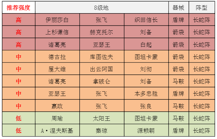 相信大家看到八級(jí)地守軍的陣容時(shí)已經(jīng)了解到他們的強(qiáng)勢之處,張飛、諸葛亮這類優(yōu)質(zhì)五星將領(lǐng)都被安排到的守軍中,同時(shí)守軍的將領(lǐng)搭配趨于輸出+防守或輸出+恢復(fù),逐漸向玩家的正常搭配靠攏,建議大家盡量選擇技能聯(lián)動(dòng)性較低,將領(lǐng)較弱的野地嘗試。
